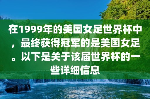 在1999年的美国女足世界杯中,最终获得冠军的是美国女足。以下是关于该届世界杯的一些详细信息
