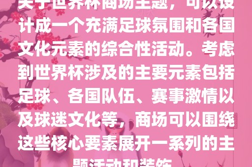 关于世界杯商场主题,可以设计成一个充满足球氛围和各国文化元素的综合性活动。考虑到世界杯涉及的主要元素包括足球、各国队伍、赛事激情以及球迷文化等,商场可以围绕这些核心要素展开一系列的主题活动和装饰。