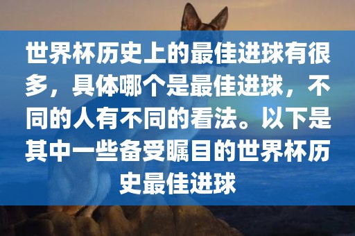 世界杯历史上的最佳进球有很多,具体哪个是最佳进球,不同的人有不同的看法。以下是其中一些备受瞩目的世界杯历史最佳进球